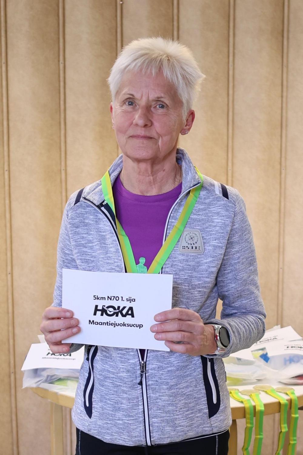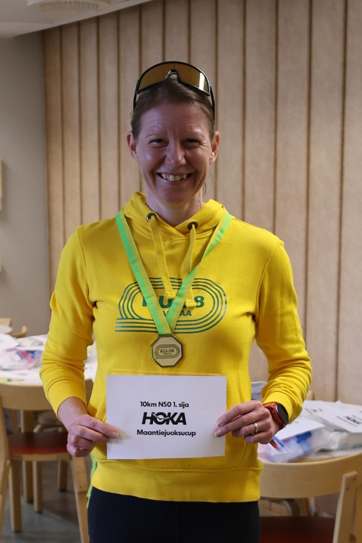 KU-58:n Sanna Kullberg iloitsi uusista HOKA-lenkkareista 50-sarjan voiton kunniaksi.